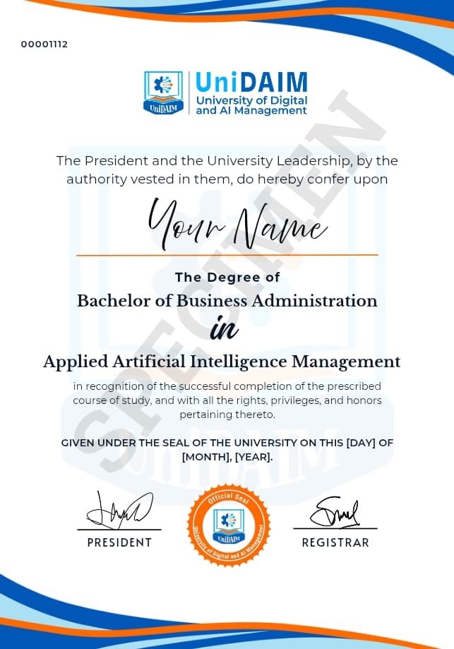 The Bachelor of Business Administration (BBA) in Applied AI Management at UniDAIM is a future-focused degree designed for students who want to master both business fundamentals and cutting-edge AI applications. This program blends management, marketing, finance, entrepreneurship, and organizational studies with artificial intelligence, machine learning, and digital innovation. By graduation, students will not only understand the traditional principles of business but also learn to apply AI-driven strategies in real-world contexts, preparing them for leadership roles in the AI-powered global economy.