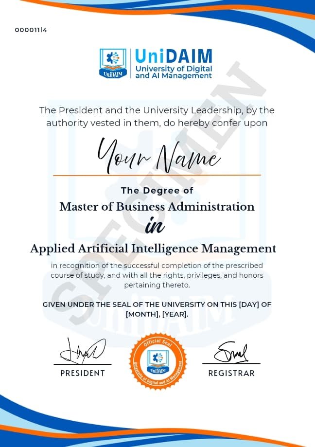The MBA in Applied AI Management at the University of Digital and AI Management (UniDAIM) is designed for future-focused professionals who want to master the intersection of business strategy, leadership, and artificial intelligence. This program blends core MBA principles with cutting-edge AI applications, equipping graduates with the expertise to lead organizations in a digitally driven world. With a strong foundation in finance, communication, economics, and leadership, combined with specialized modules on AI systems, intelligent automation, big data, cloud strategy, and ethical governance, this MBA prepares learners to navigate the complexities of the 21st-century business landscape.